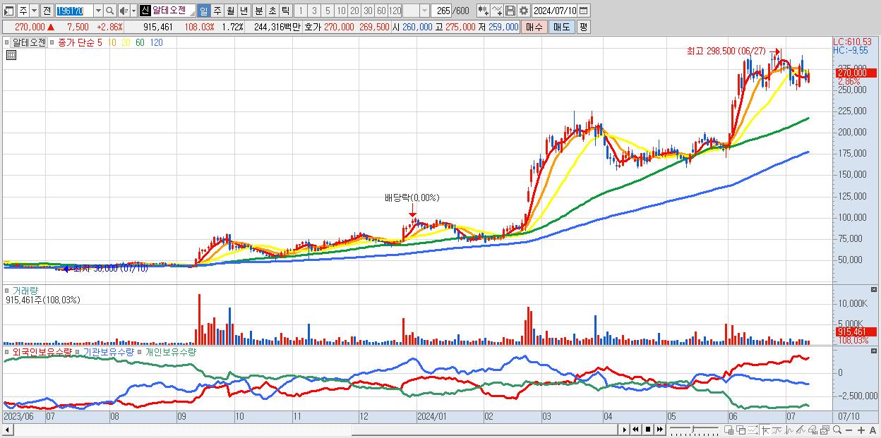 - 알테오젠 (270,000원 ▲ 2.86% , 시총: 143,501억, 거래량: 915,461, 거래대금:2,443억)