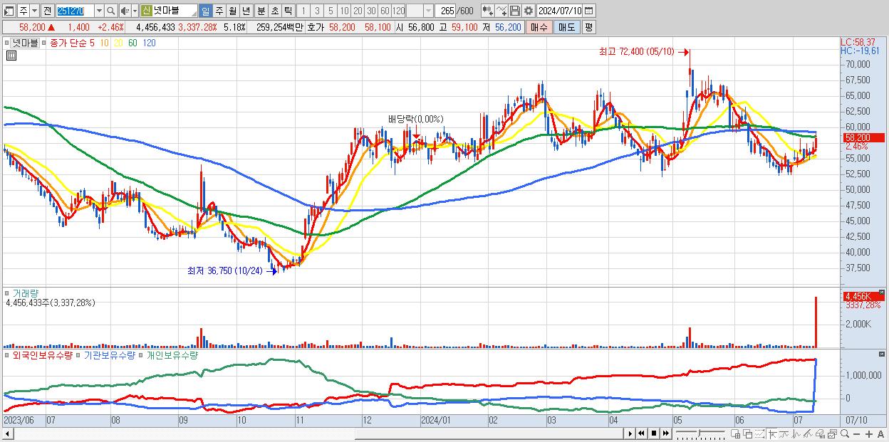 - 넷마블 (58,200원 ▲ 2.46% , 시총: 50,025억, 거래량: 4,456,433, 거래대금:2,593억)