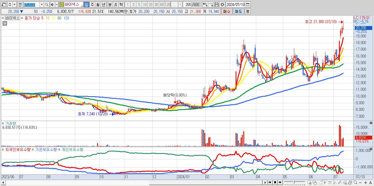 - 바이넥스 (20,200원 ▼ -0.25% , 시총: 6,416억, 거래량: 6,830,517, 거래대금:1,406억)