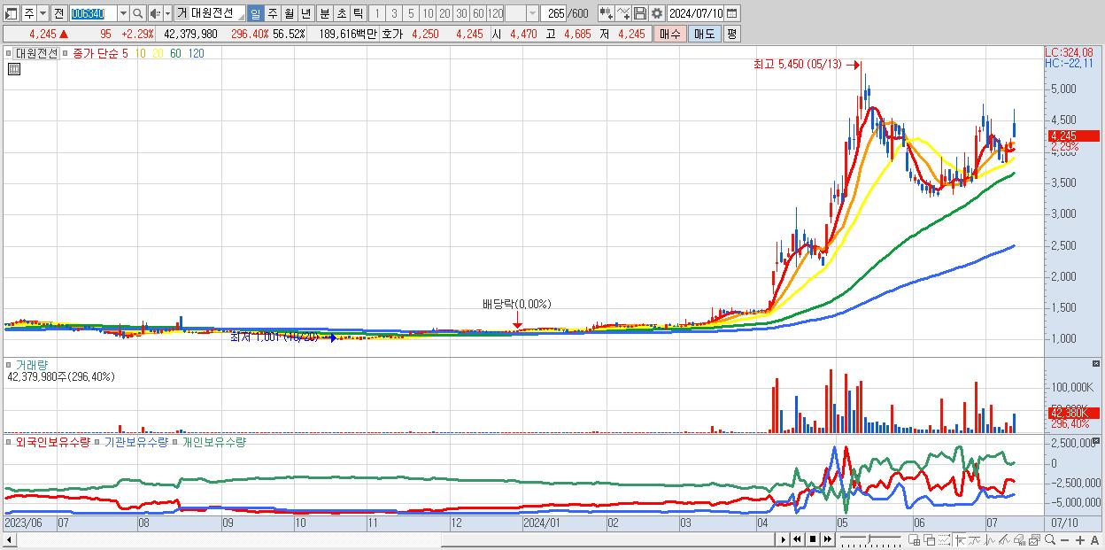 - 대원전선 (4,245원 ▲ 2.29% , 시총: 3,183억, 거래량: 42,379,980, 거래대금:1,896억)