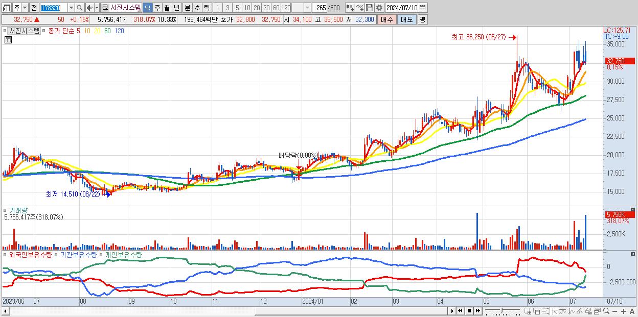 - 서진시스템 (32,750원 ▲ 0.15% , 시총: 18,243억, 거래량: 5,756,417, 거래대금:1,955억)