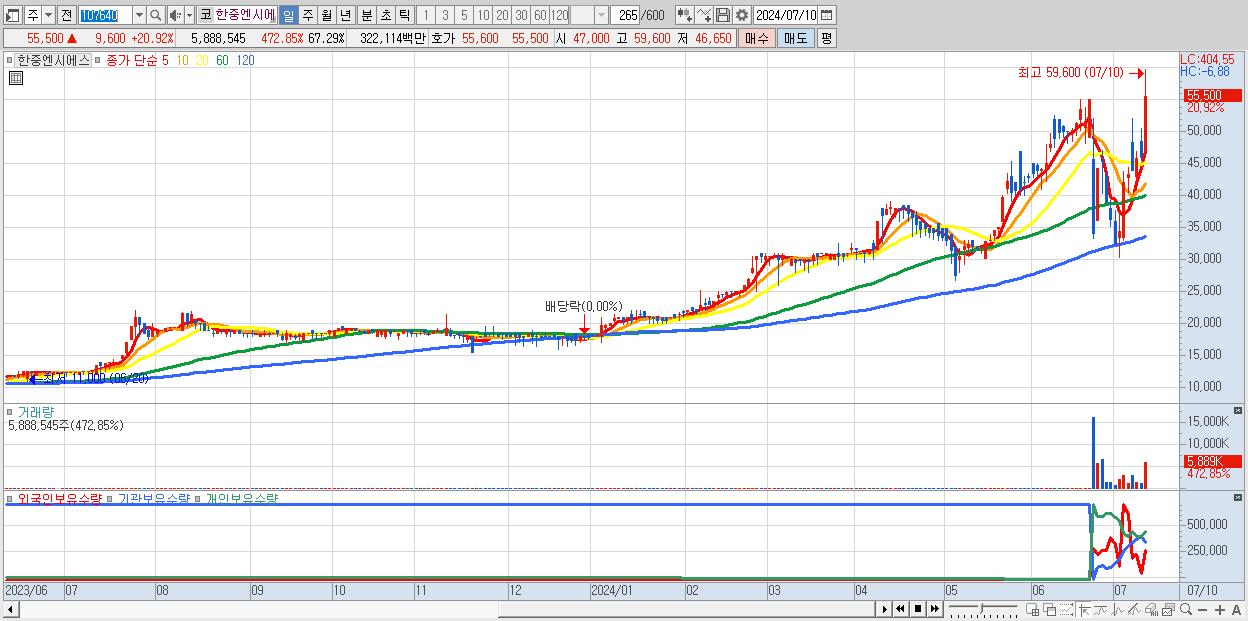 - 한중엔시에스 (55,500원 ▲ 20.92% , 시총: 4,857억, 거래량: 5,888,545, 거래대금:3,221억)