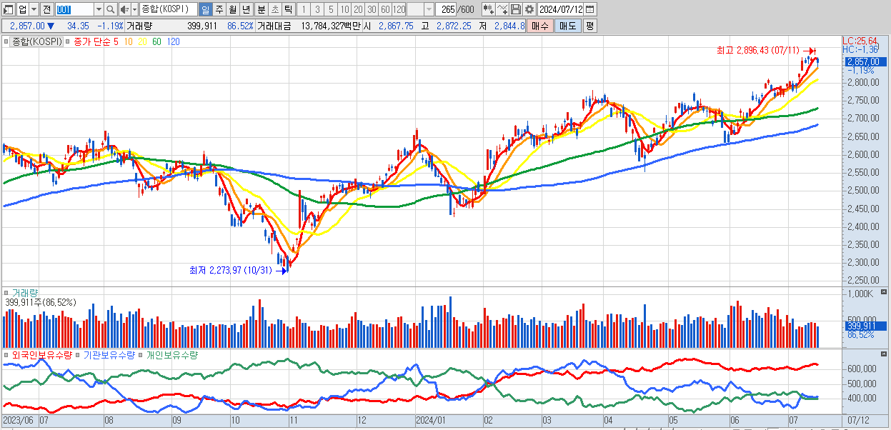 | 07/11 | 2,891.35 | ▲0.81% | -3,476억 | 6,099억 | -849억 | -1,774억 |