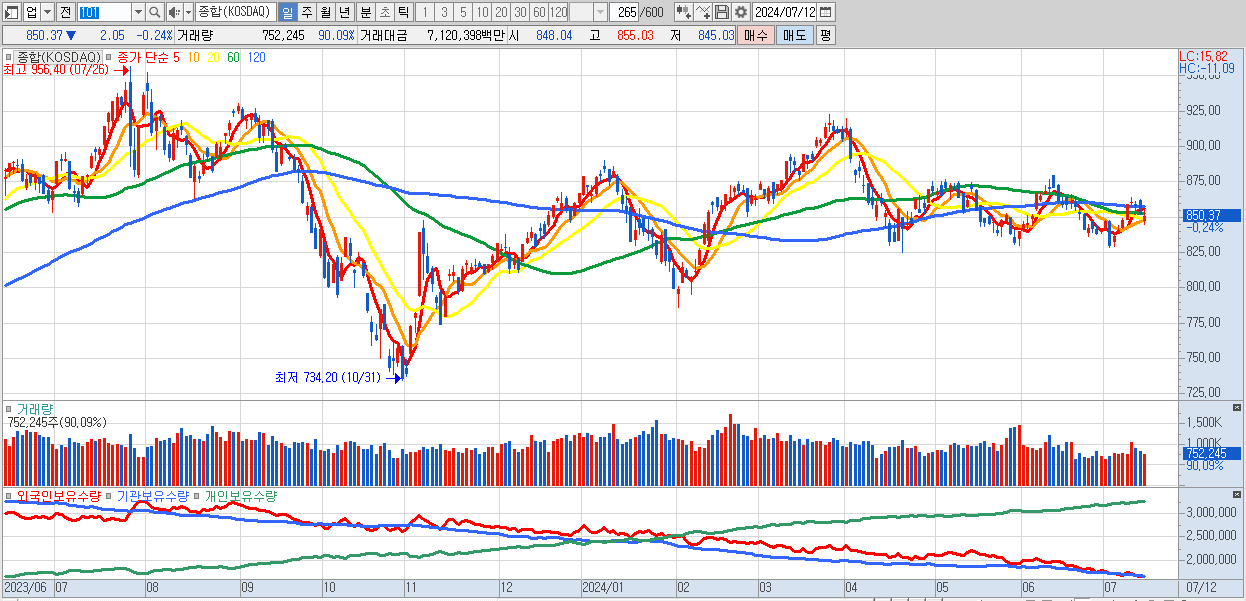 | 07/09 | 860.42 | ▲0.13% | 1,723억 | -616억 | -1,067억 | -40억 |
