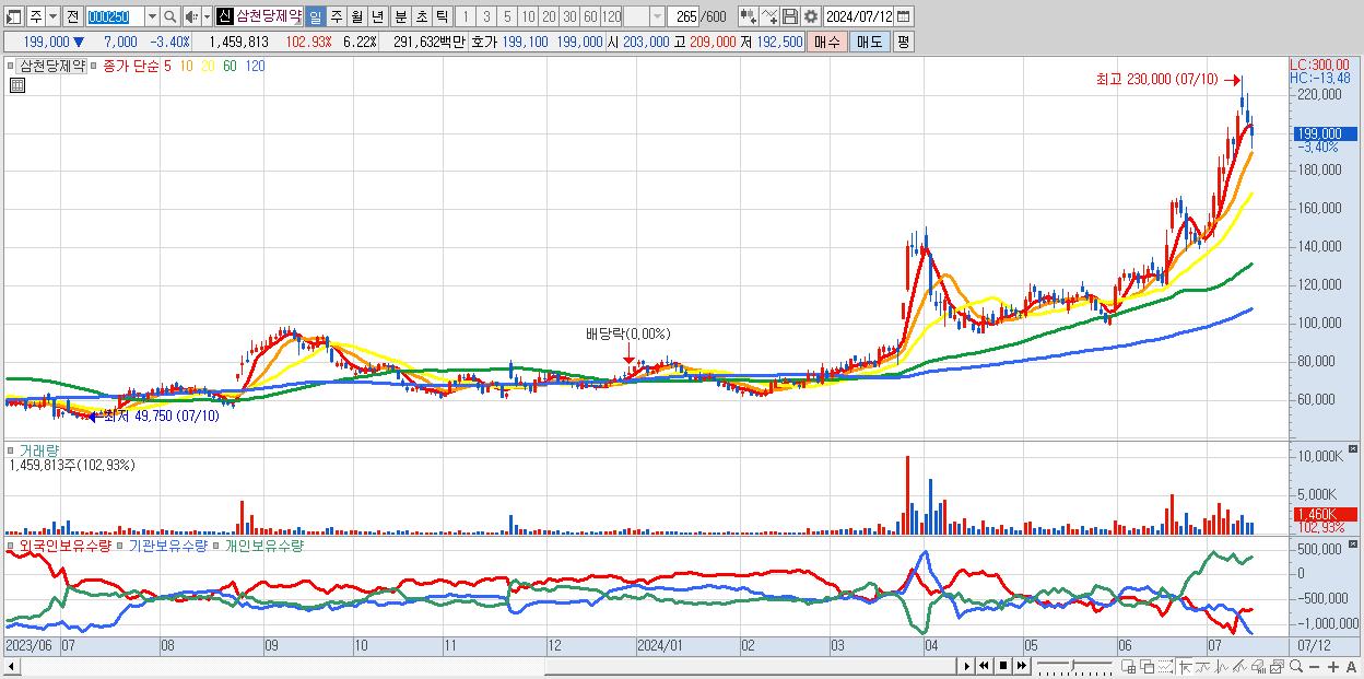 - 삼천당제약 (199,000원 ▼ -3.4% , 시총: 46,680억, 거래량: 1,459,813, 거래대금:2,916억)