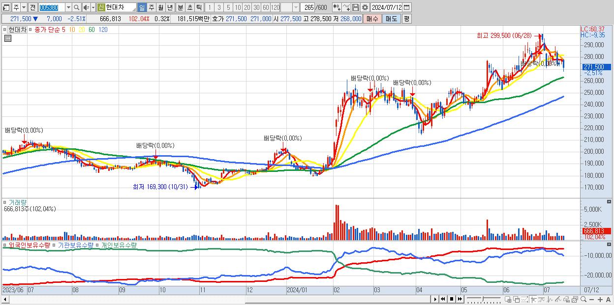- 현대차 (271,500원 ▼ -2.51% , 시총: 568,565억, 거래량: 666,813, 거래대금:1,815억)