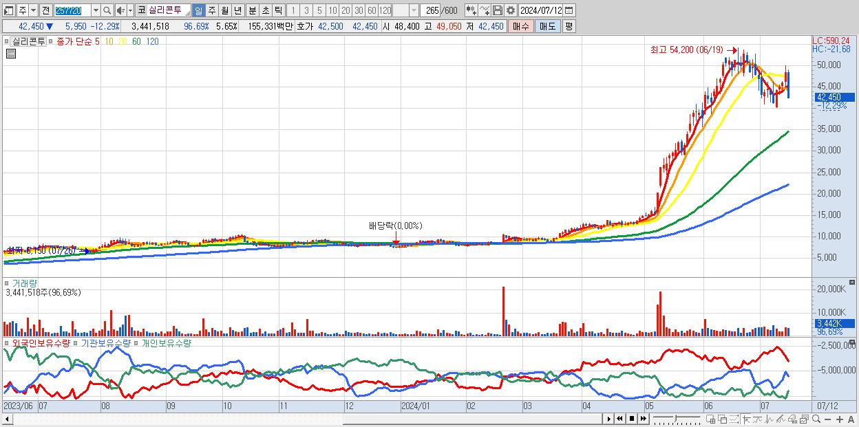 - 실리콘투 (42,450원 ▼ -12.29% , 시총: 25,841억, 거래량: 3,441,518, 거래대금:1,553억)