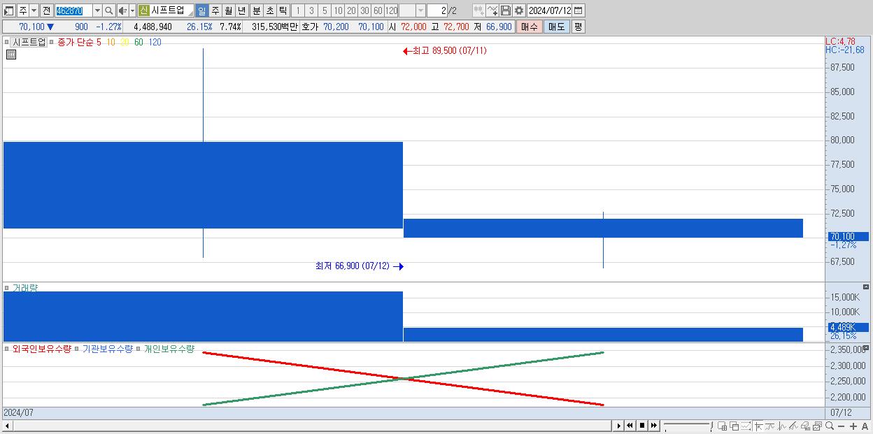 - 시프트업 (70,100원 ▼ -1.27% , 시총: 40,676억, 거래량: 4,488,940, 거래대금:3,155억)