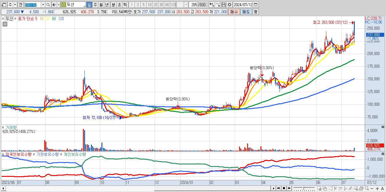 - 두산 (237,000원 ▼ -1.86% , 시총: 39,161억, 거래량: 626,925, 거래대금:1,505억)