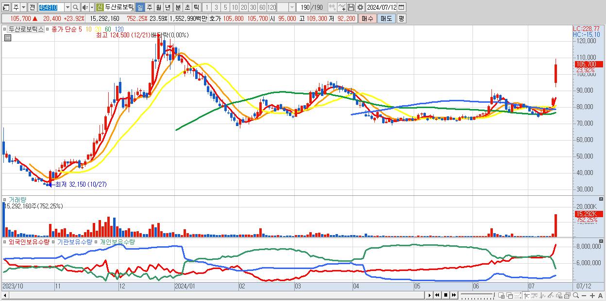 - 두산로보틱스 (105,700원 ▲ 23.92% , 시총: 68,515억, 거래량: 15,292,160, 거래대금:15,530억)