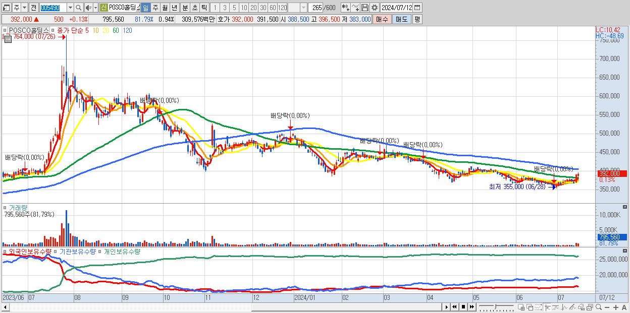 - POSCO홀딩스 (392,000원 ▲ 0.13% , 시총: 331,519억, 거래량: 795,560, 거래대금:3,096억)