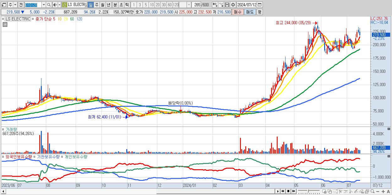- LS ELECTRIC (219,500원 ▼ -2.23% , 시총: 65,850억, 거래량: 667,209, 거래대금:1,503억)
