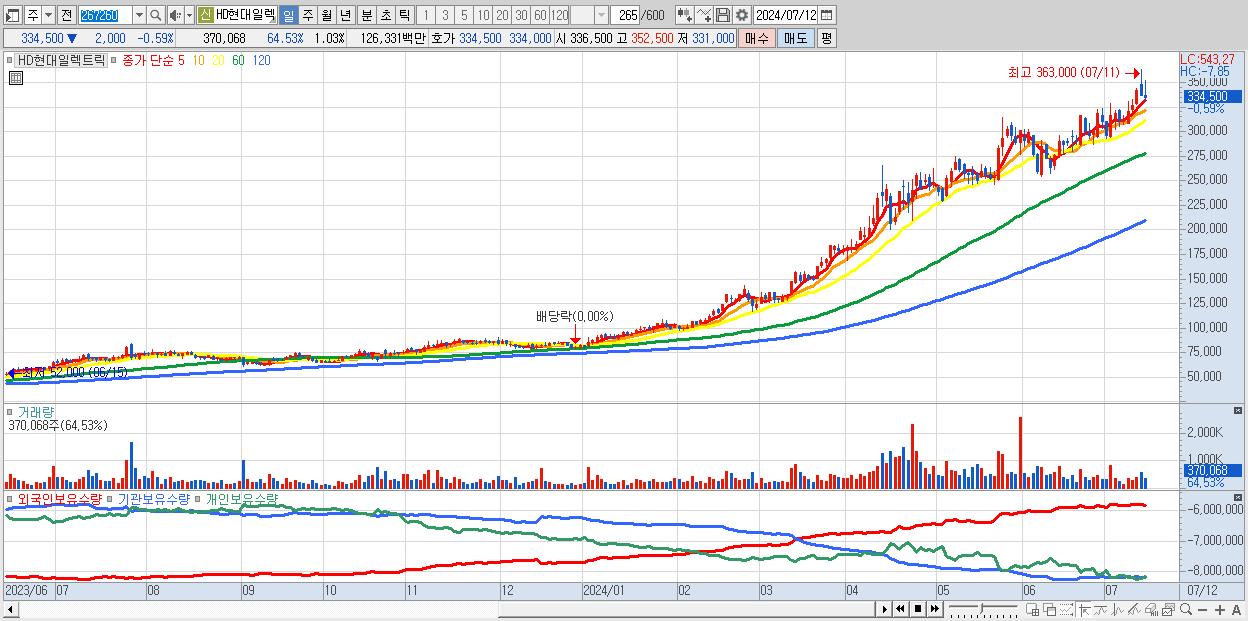 - HD현대일렉트릭 (334,500원 ▼ -0.59% , 시총: 120,578억, 거래량: 370,068, 거래대금:1,263억)