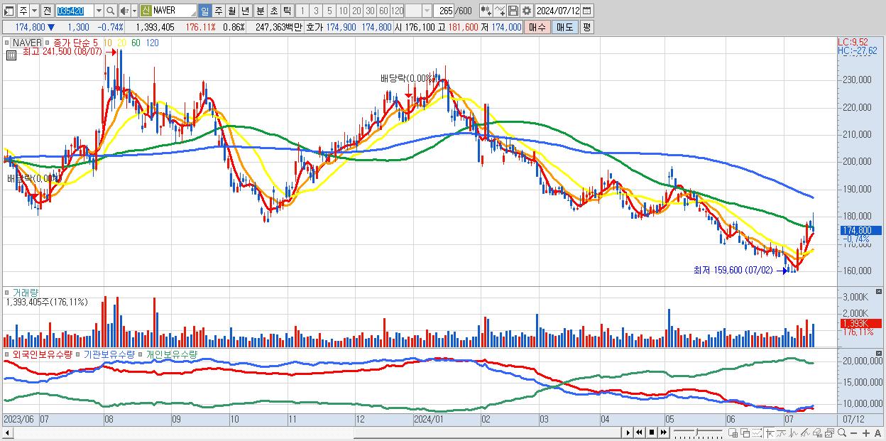 - NAVER (174,800원 ▼ -0.74% , 시총: 283,890억, 거래량: 1,393,405, 거래대금:2,474억)