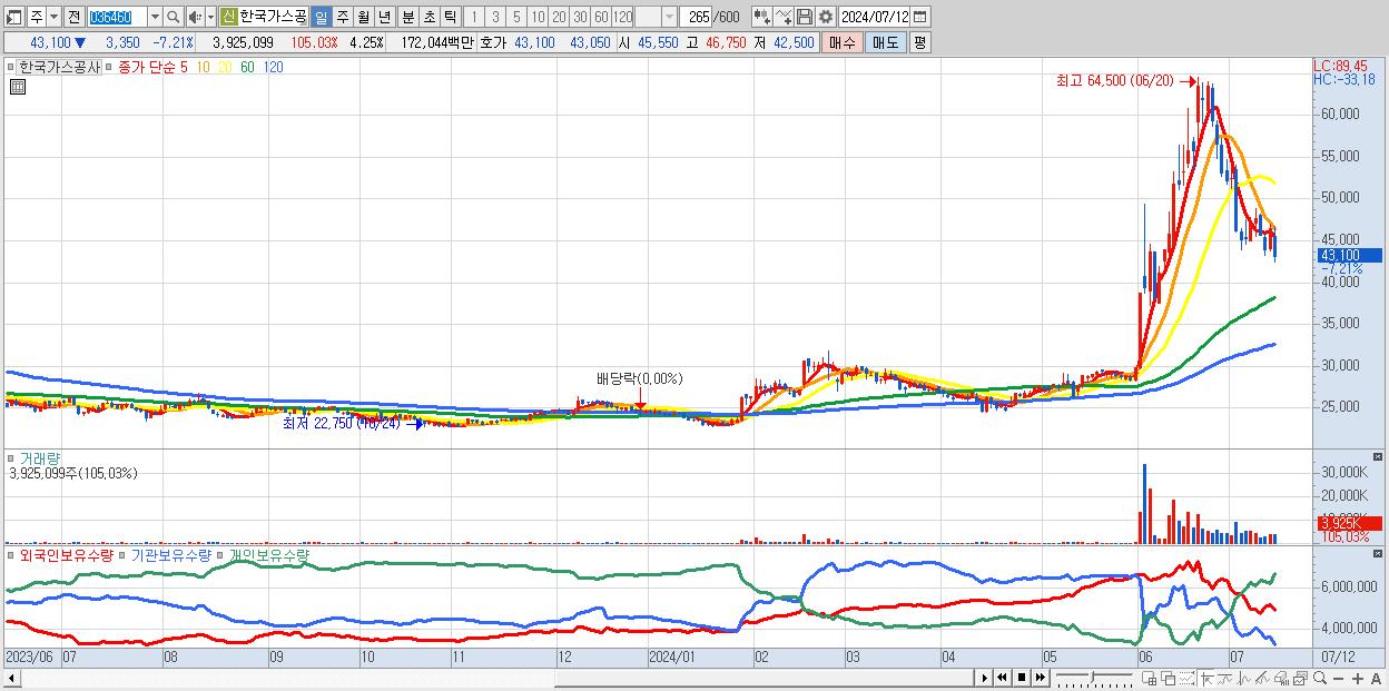 - 한국가스공사 (43,100원 ▼ -7.21% , 시총: 39,787억, 거래량: 3,925,099, 거래대금:1,720억)