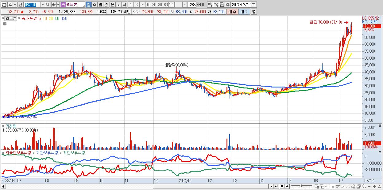 - 펩트론 (73,200원 ▲ 5.32% , 시총: 15,121억, 거래량: 1,989,866, 거래대금:1,458억)