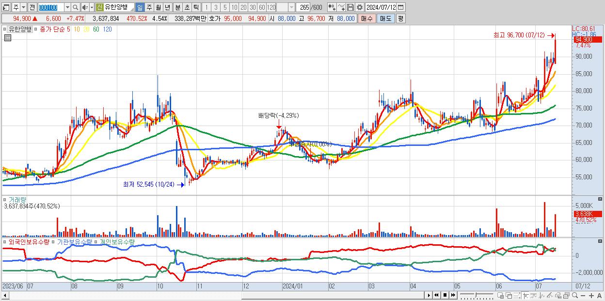 - 유한양행 (94,900원 ▲ 7.47% , 시총: 76,118억, 거래량: 3,637,834, 거래대금:3,383억)