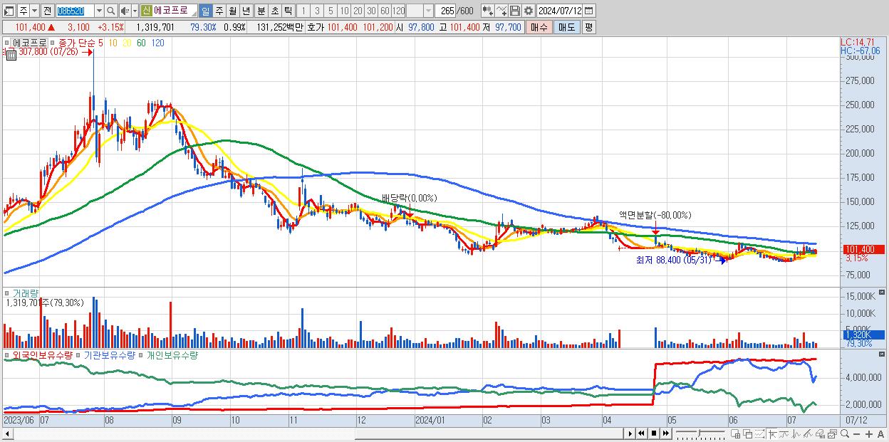 - 에코프로 (101,400원 ▲ 3.15% , 시총: 135,002억, 거래량: 1,319,701, 거래대금:1,313억)