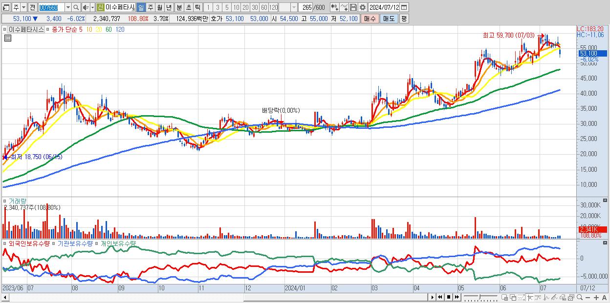 - 이수페타시스 (53,100원 ▼ -6.02% , 시총: 33,584억, 거래량: 2,340,737, 거래대금:1,249억)