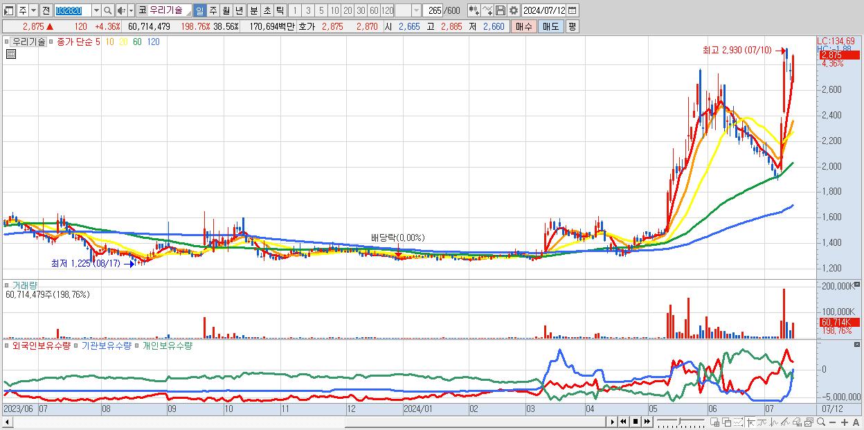 - 우리기술 (2,875원 ▲ 4.36% , 시총: 4,526억, 거래량: 60,714,479, 거래대금:1,707억)
