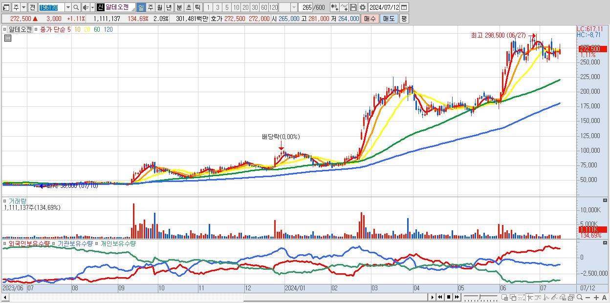 - 알테오젠 (272,500원 ▲ 1.11% , 시총: 144,830억, 거래량: 1,111,137, 거래대금:3,015억)