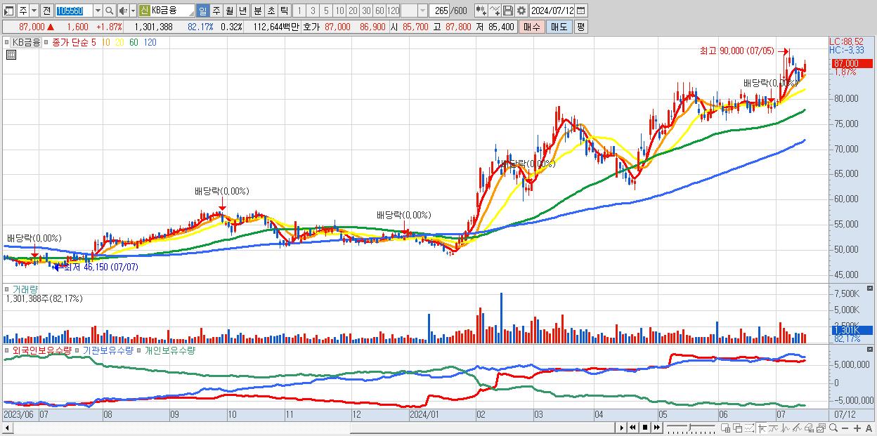 - KB금융 (87,000원 ▲ 1.87% , 시총: 351,055억, 거래량: 1,301,388, 거래대금:1,126억)