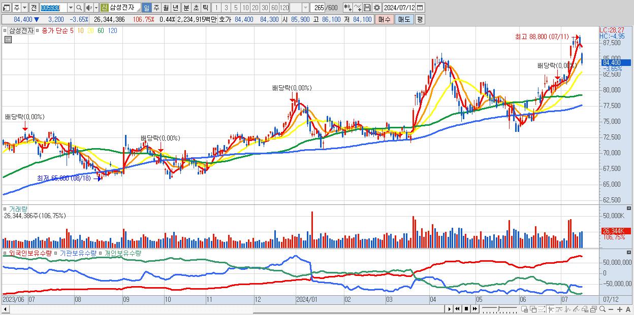 1.삼성전자 84,400원 ▼ -3.65% (KOSPI, 005930)