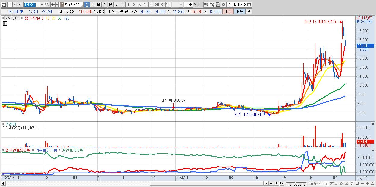 - 한전산업 (14,380원 ▼ -7.29% , 시총: 4,688억, 거래량: 8,614,829, 거래대금:1,276억)