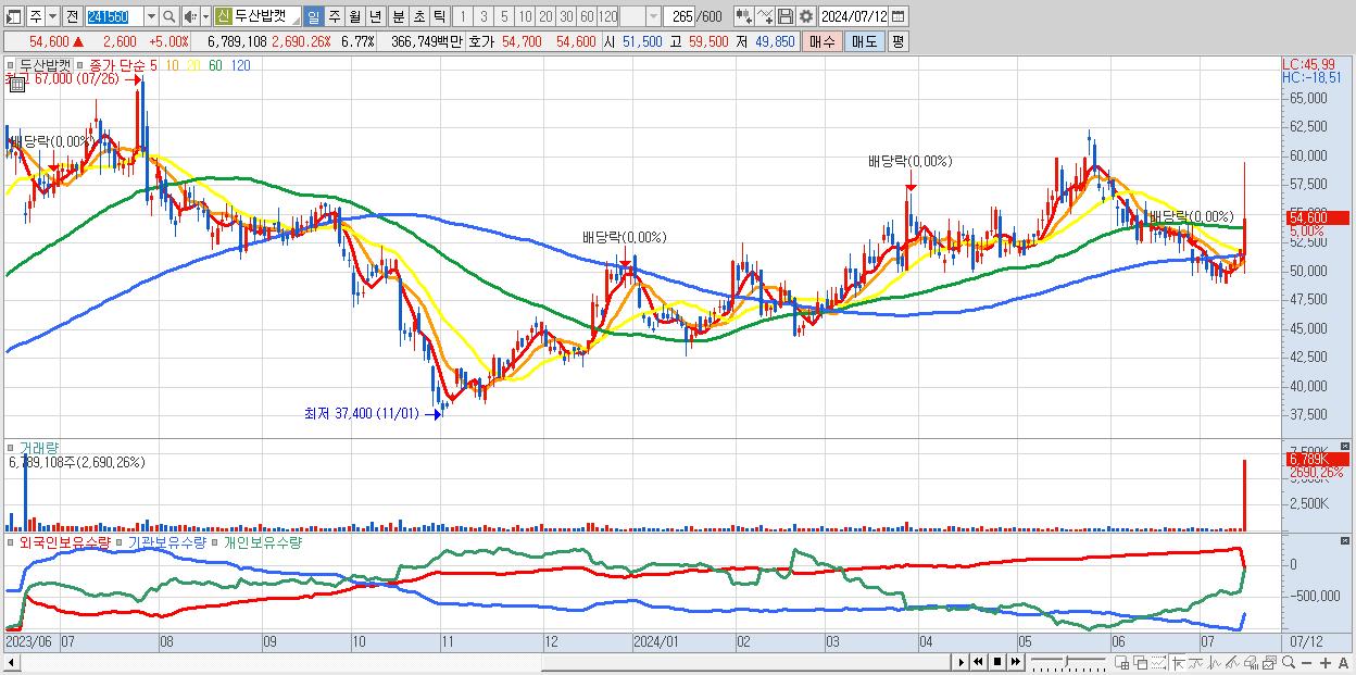 - 두산밥캣 (54,600원 ▲ 5% , 시총: 54,736억, 거래량: 6,789,108, 거래대금:3,667억)