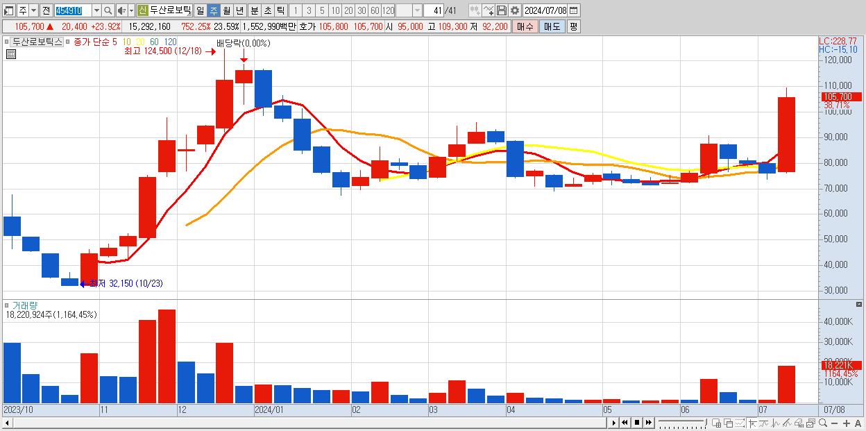 - 두산로보틱스 (105,700원 ▲ 38.71% , 시총: 68,515억, 거래량: 18,220,924, 거래대금:17,952억)