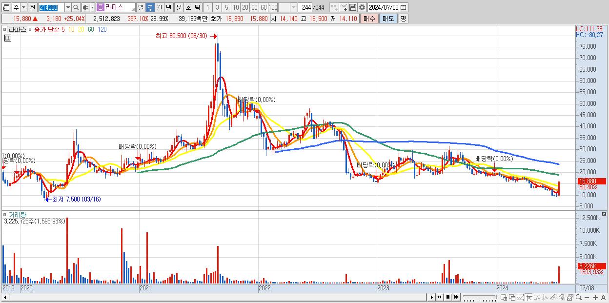 - 라파스 (15,880원 ▲ 60.4% , 시총: 1,376억, 거래량: 3,225,723, 거래대금:472억)