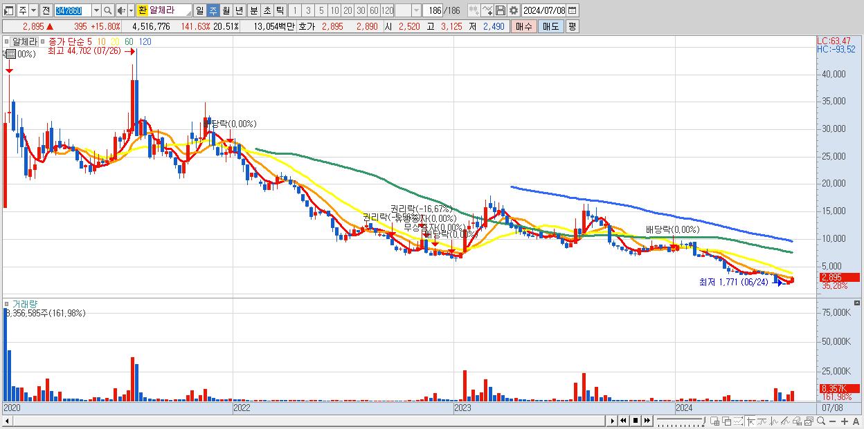 - 알체라 (2,895원 ▲ 35.28% , 시총: 637억, 거래량: 8,356,585, 거래대금:227억)