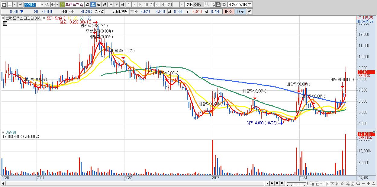 - 브랜드엑스코퍼레이션 (8,610원 ▲ 33.9% , 시총: 2,524억, 거래량: 17,183,481, 거래대금:1,421억)