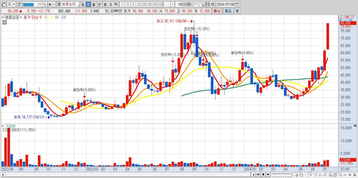 - 보로노이 (80,200원 ▲ 29.98% , 시총: 14,260억, 거래량: 2,523,580, 거래대금:1,796억)