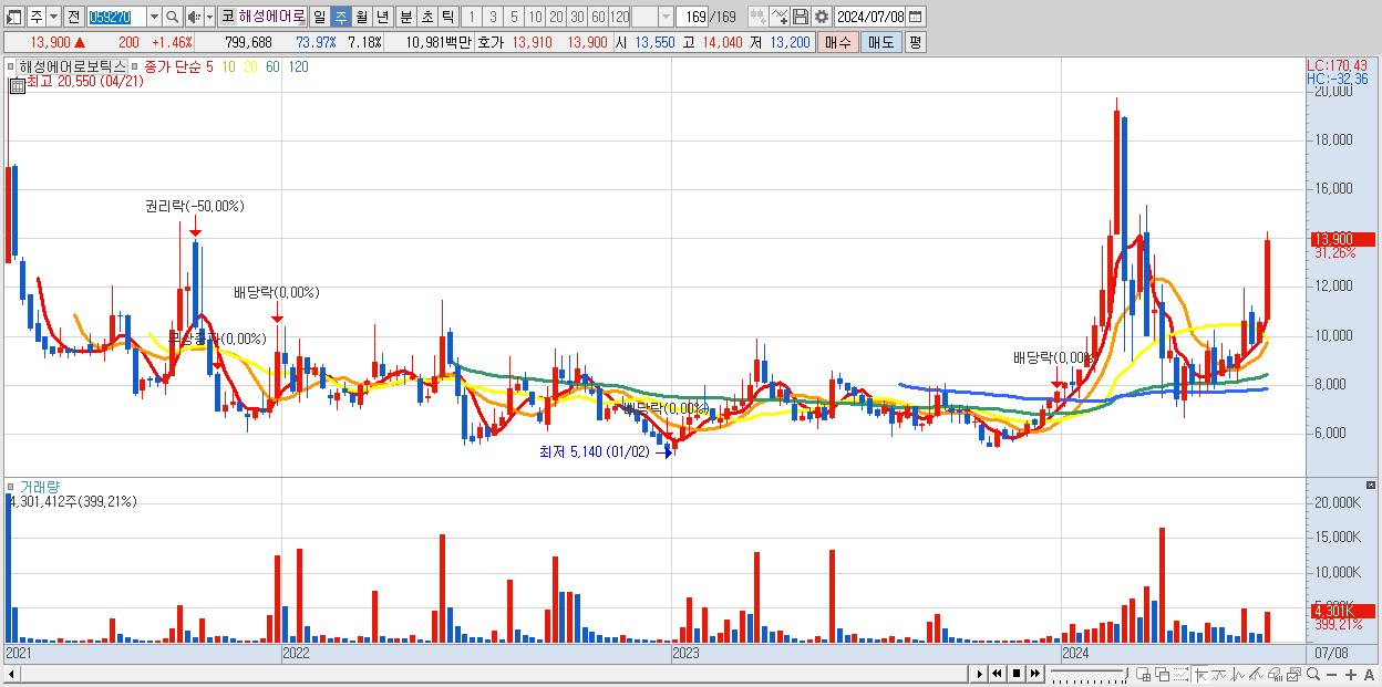 - 해성에어로보틱스 (13,900원 ▲ 31.26% , 시총: 1,549억, 거래량: 4,301,412, 거래대금:550억)