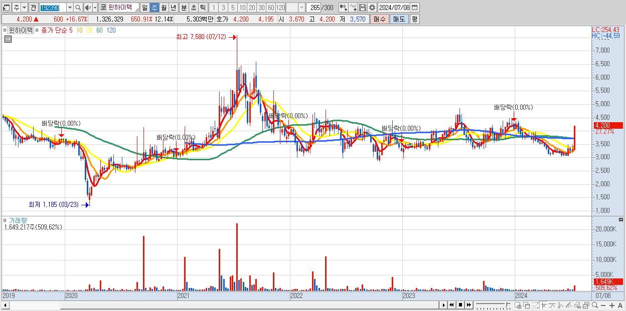 - 윈하이텍 (4,200원 ▲ 27.27% , 시총: 459억, 거래량: 1,649,217, 거래대금:64억)