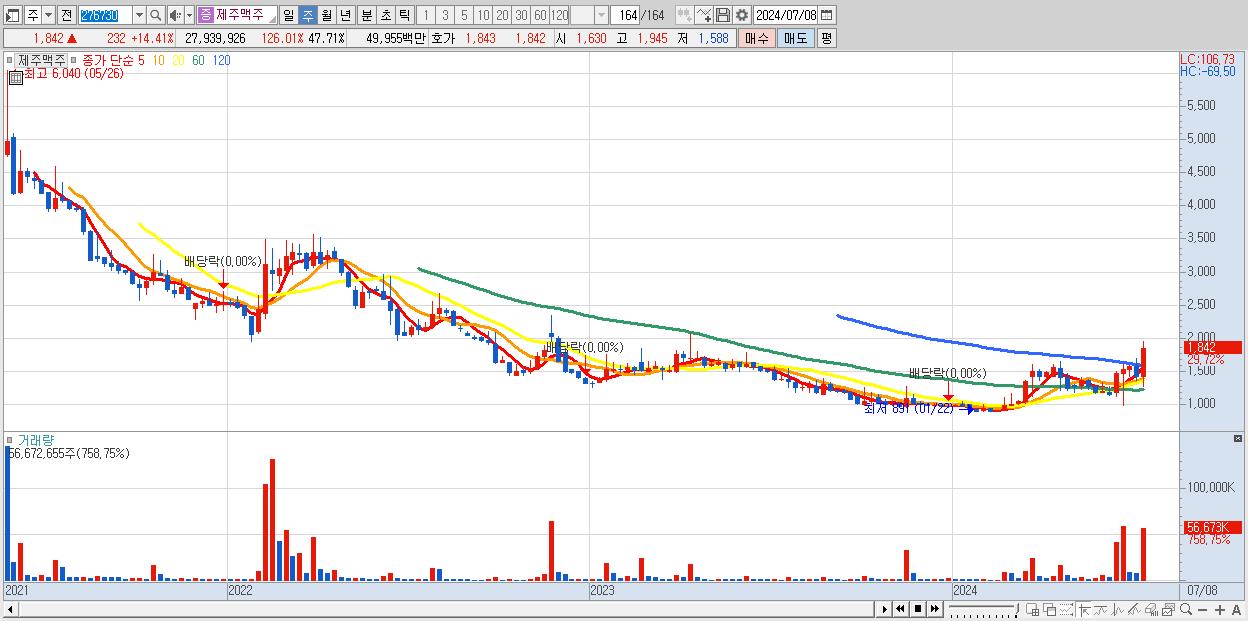 - 제주맥주 (1,842원 ▲ 29.72% , 시총: 1,079억, 거래량: 56,672,655, 거래대금:954억)
