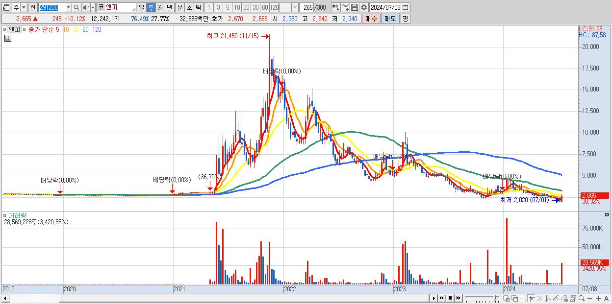 - 엔피 (2,665원 ▲ 30.32% , 시총: 1,175억, 거래량: 28,569,228, 거래대금:752억)