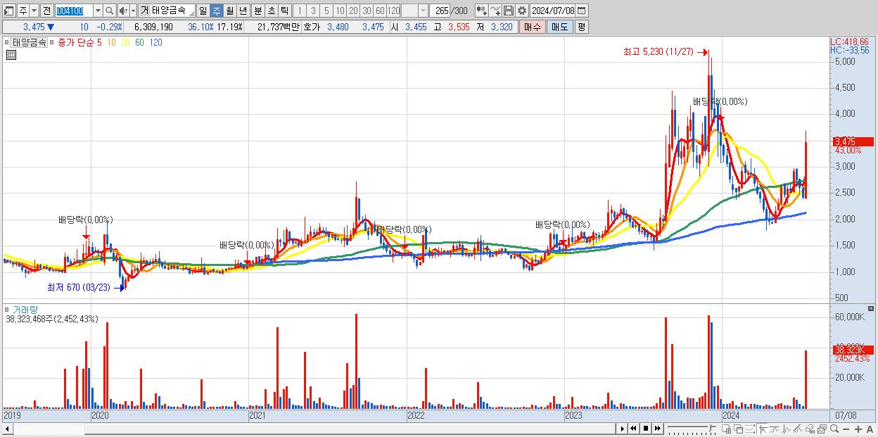 - 태양금속 (3,475원 ▲ 43% , 시총: 1,275억, 거래량: 38,323,468, 거래대금:1,270억)