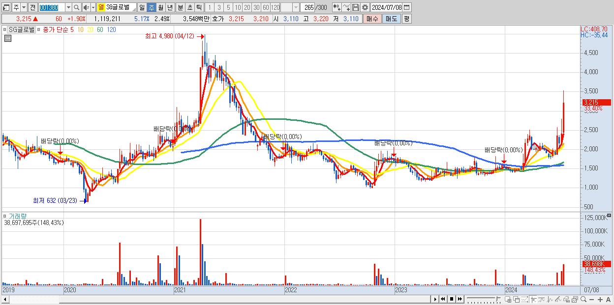 - SG글로벌 (3,215원 ▲ 33.4% , 시총: 1,446억, 거래량: 38,697,695, 거래대금:1,192억)