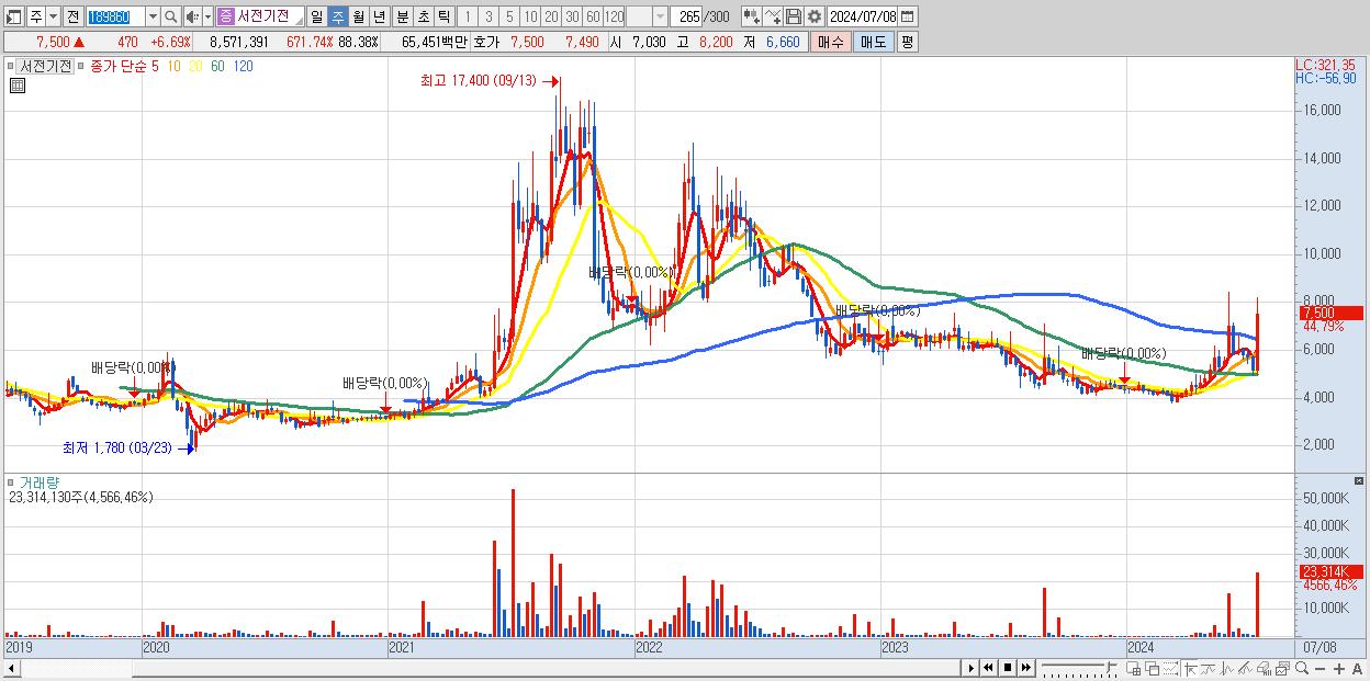 - 서전기전 (7,500원 ▲ 44.79% , 시총: 727억, 거래량: 23,314,130, 거래대금:1,665억)