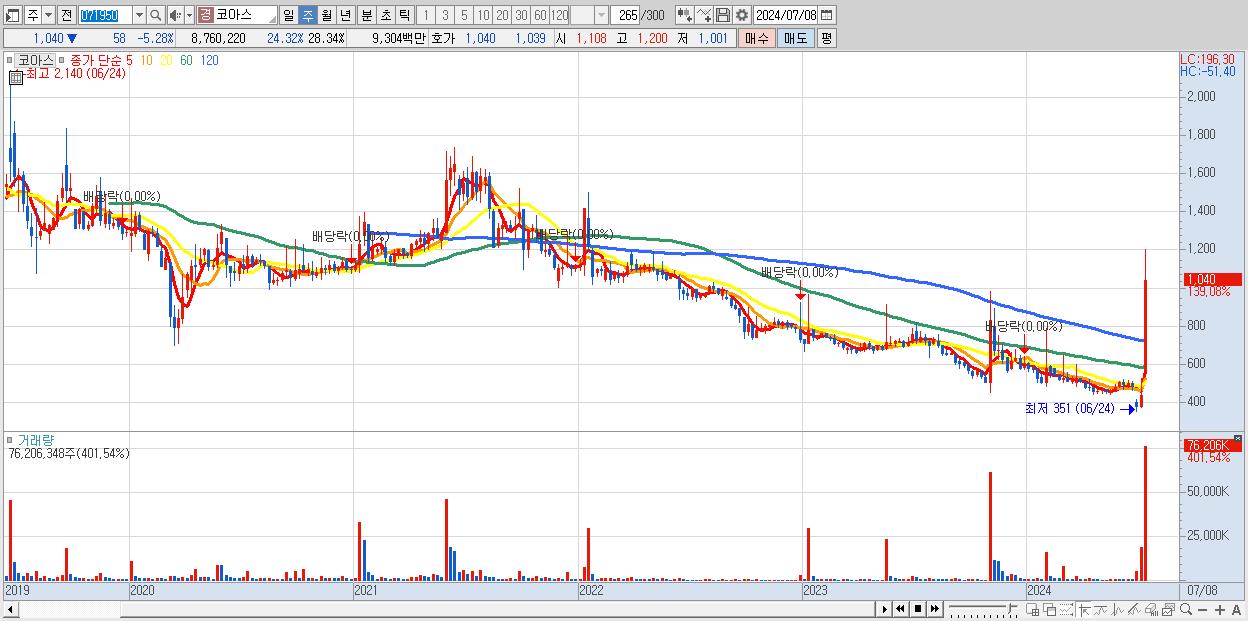 1.코아스 1,040원 ▲ 139.08% (KOSPI, 071950)