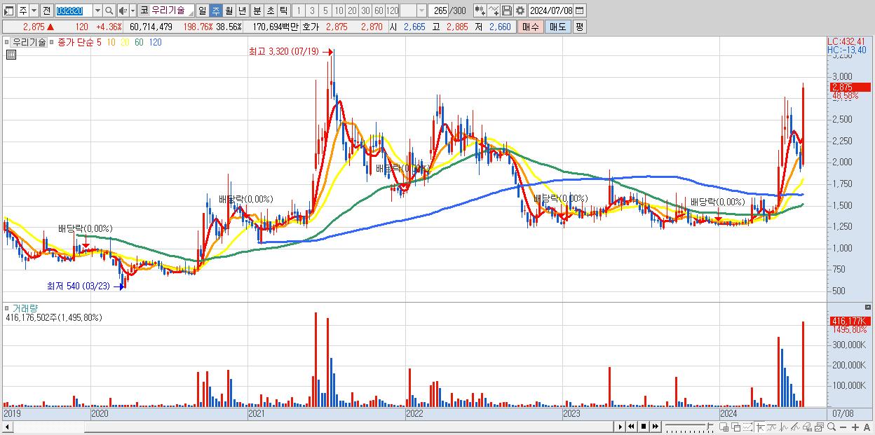 - 우리기술 (2,875원 ▲ 48.58% , 시총: 4,526억, 거래량: 416,176,502, 거래대금:11,122억)
