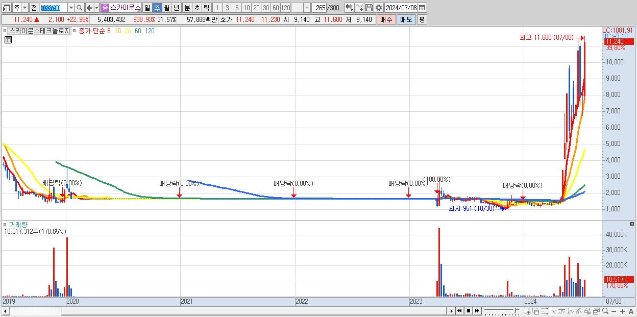 - 스카이문스테크놀로지 (11,240원 ▲ 39.8% , 시총: 1,924억, 거래량: 10,517,312, 거래대금:1,037억)