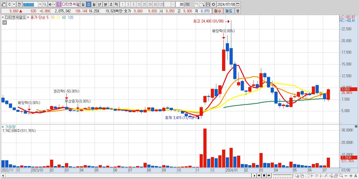 - 디티앤씨알오 (9,660원 ▲ 26.94% , 시총: 1,234억, 거래량: 7,742,698, 거래대금:691억)