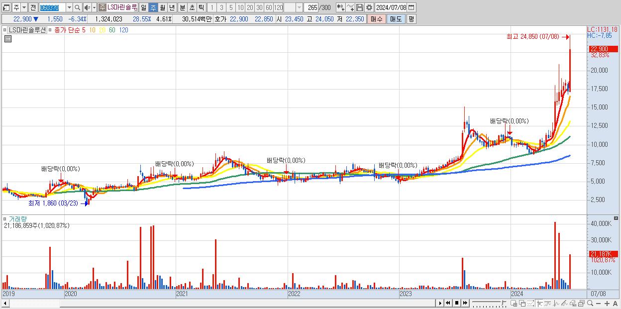 - LS마린솔루션 (22,900원 ▲ 32.83% , 시총: 6,574억, 거래량: 21,186,859, 거래대금:4,605억)
