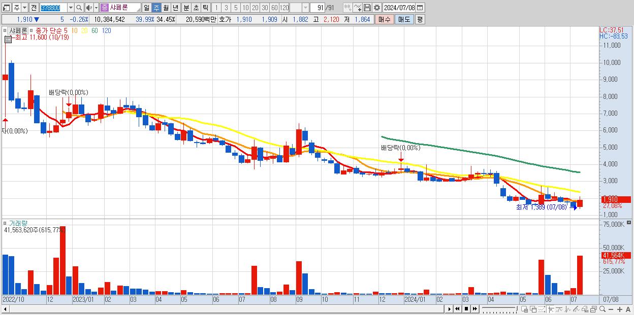 - 샤페론 (1,910원 ▲ 27.08% , 시총: 576억, 거래량: 41,563,620, 거래대금:795억)