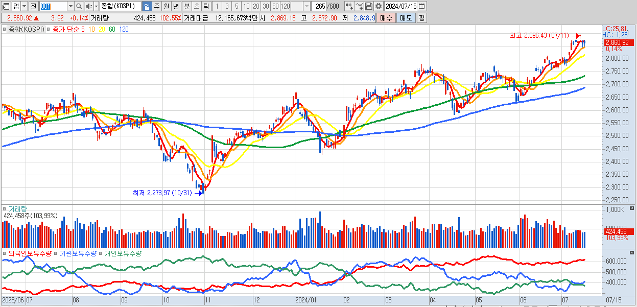 | 07/15 | 2,860.92 | ▲0.14% | -367억 | -774억 | 1,257억 | -116억 |
