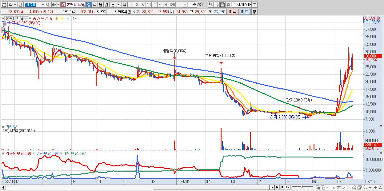 - 휴림네트웍스 (28,600원 ▲ 19.17% , 시총: 798억, 거래량: 239,147, 거래대금:66억)