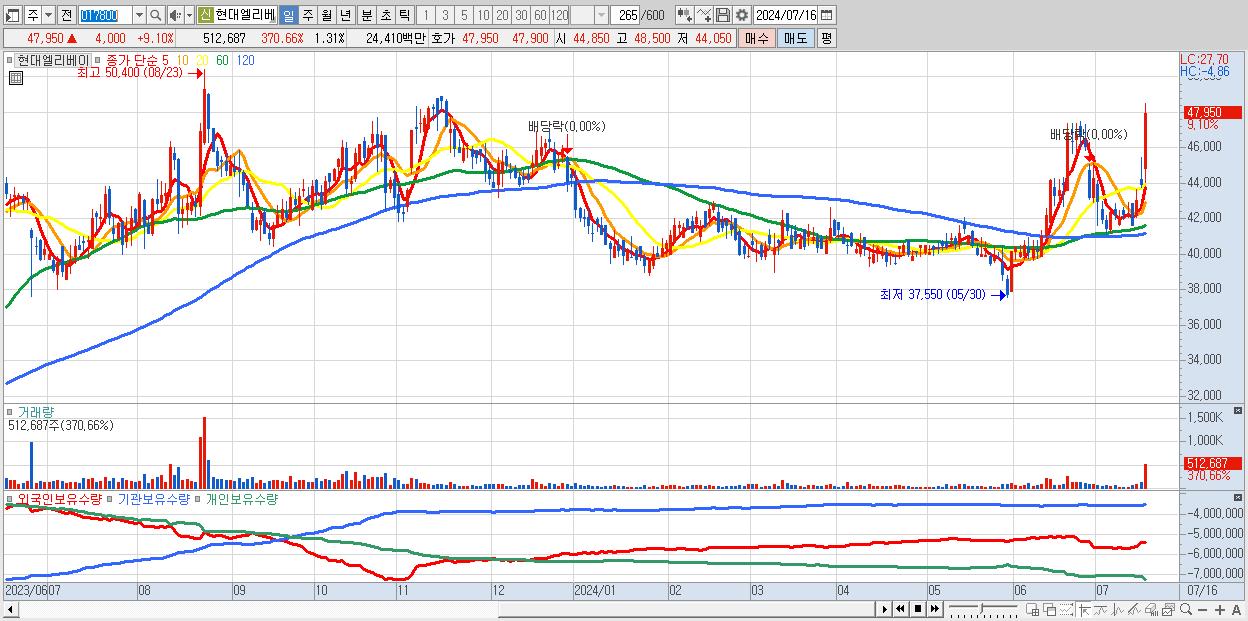 30.현대엘리베이 47,950원 ▲ 9.1% (KOSPI, 017800)